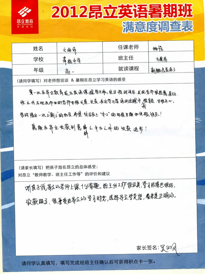| 2012昂立英语暑假班满意度反馈表-文雨诗 | |||