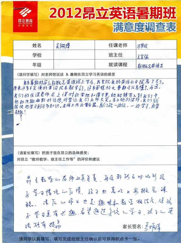 | 2012昂立英语暑假班满意度反馈表-吴佩璋 | |||