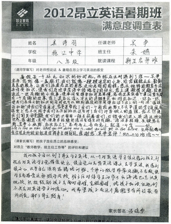 | 2012昂立英语暑假班满意度反馈表-吴诗羽 | |||