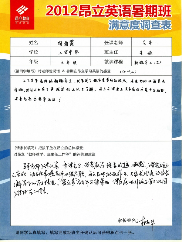 | 2012昂立英语暑假班满意度反馈表-向宇霆 | |||