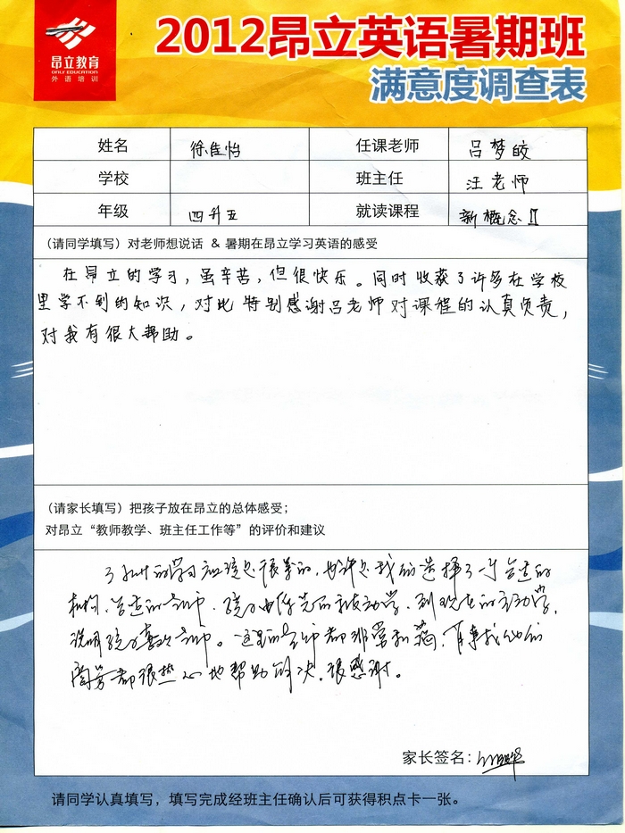 | 2012昂立英语暑假班满意度反馈表-徐佳怡 | |||