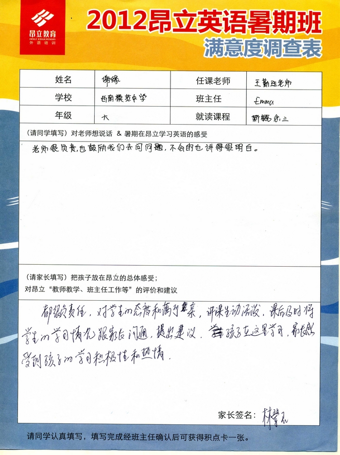 2012昂立英语暑假班满意度反馈表-谢缘 发表时间:2012-11-19